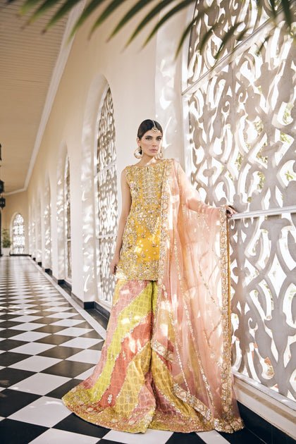 Beautiful Pakistani bridal collection is geared up with designer mehendi outfit in yellow and peach color to add an alluring touch to your wedding wardrobe. Top Shirt: Top shirt in yellow color is fully embellished with eye catching embroidery with dabka, gotta, zari, sequins and beautifully embroidered patches. Mehndi shirt is embellished with golden embroidered neckline. Sharara: Multi color sharara [...]