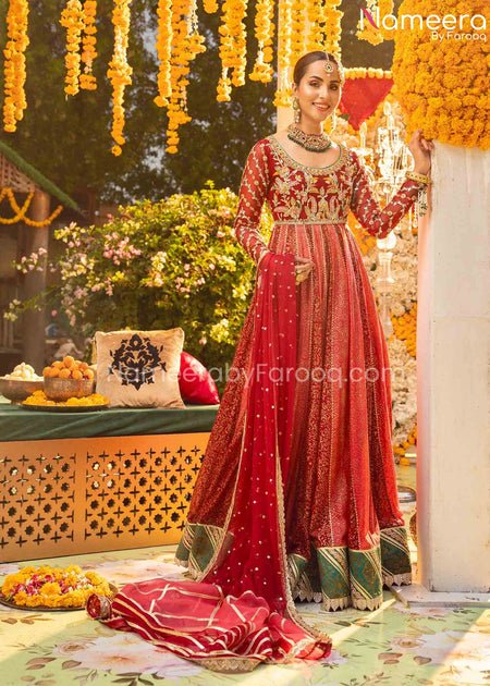 Bridal Floor Length Frock Suit in Pishwas Style has an alluring red shade. The premium quality Net silk makes this Pishwas Dress an epitome of beauty. Zardosi and gota details make this Traditional Bridal Dress your foremost priority for the Mehndi or Dholak. When paired with customized bottoms, the Pishwas achieves the final royal look. [...]