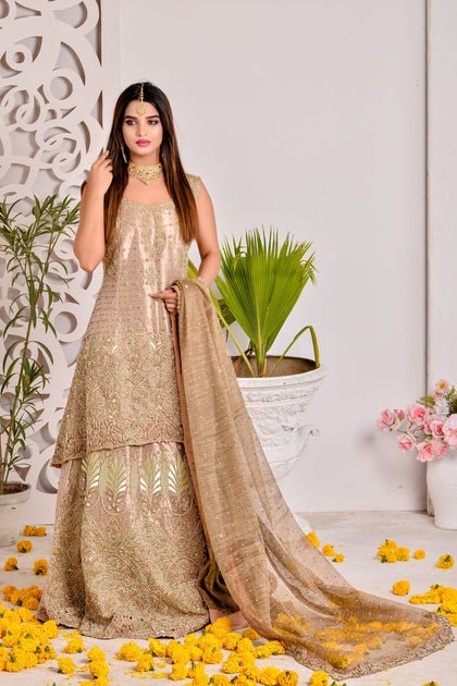 Gharara Dress Pakistani in Rusty Brown Color is a mesmerizing Pakistani Dress with beautiful yet tantalizing embellishments on it casting a magical spell on the entire look. This Pakistani Dress depicts a very magnanimous picture making you the center of the circle. Kameez: This Gharara Dress Pakistani comes with a beautiful kameez in organza. This kameez [...]