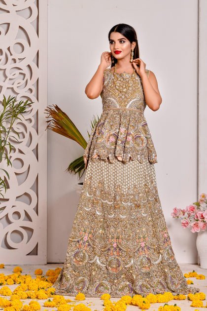 The latest Peplum Lehenga Bridal Pakistani Dress is an embellished masterpiece that steals everyone’s hearts at the very first glance, This beautiful attire is in premium quality Chiffon fabric and is beautifully adorned with hand-crafted Swarovski details and resham work making it your foremost priority for the wedding. Peplum: Bridal peplum in sleeveless design is [...]