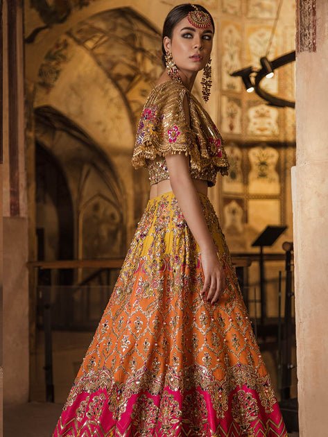 Traditional Pishwas and Sharara Mehndi Dress is a beautiful masterpiece to wear at the wedding. This stunning perfectly stitched Pakistani Bridal Dress is gracefully embellished with gota, resham, and kora dabka details creating an alluring attire for the gorgeous Bride. Pishwas: Pakistani Bridal Pishwas in the marigold shade has a premium quality Silk net fabric. [...]