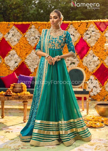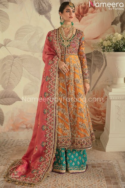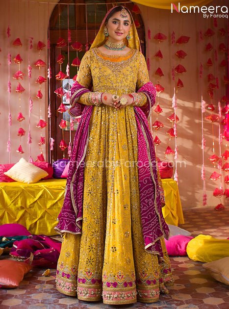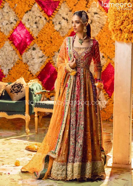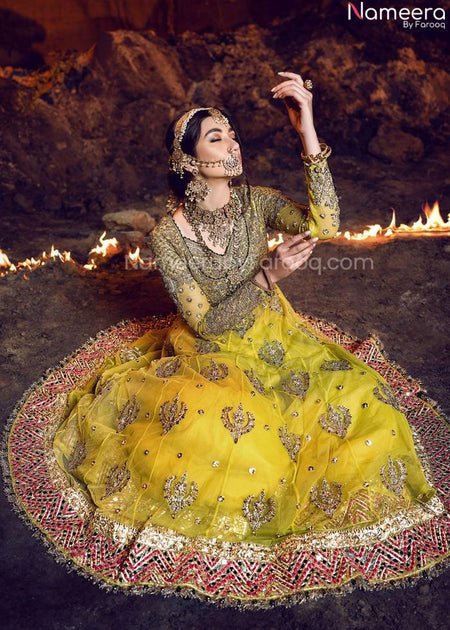 Pakistani Frock Yellow Mehndi Suit Bridal Dress is a bold and regal ensemble; Frock Gown is adorned with sprawling artwork evocative of the iconic tree of life, and intricately hand-worked worn over an intricately embellished bustier paired with embellished dupatta. So so what are you waiting for, go grab this dress and add stunning attire to [...]