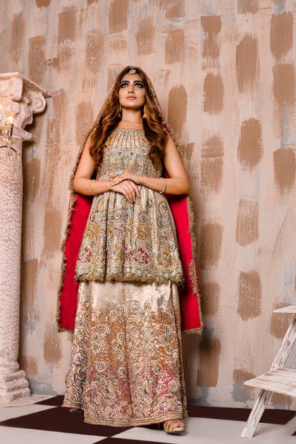 Bridal Short Frock with Lehenga Dress Pakistani is a breathtaking masterpiece gracefully embellished with shimmering details and golden work. The beaming mesuri fabric of this Pakistani Bridal Dress makes it your foremost priority for the wedding day. Beads and zardosi details give a glamorous touch to this perfectly stitched attire. Frock: Pakistani Bridal Frock in [...]