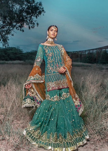 Traditional Emerald Bridal Gharara Kameez Dress is the epitome of tradition and royalty. This beautiful Gharara Dress is adorned with zardosi details and classic work of embellishments making this traditional attire a perfect attire for Mehndi or any wedding festivity. Kameez: Kameez is beautifully emblazoned with dabka, tilla, and embroidery work. Colorful floral designs and [...]